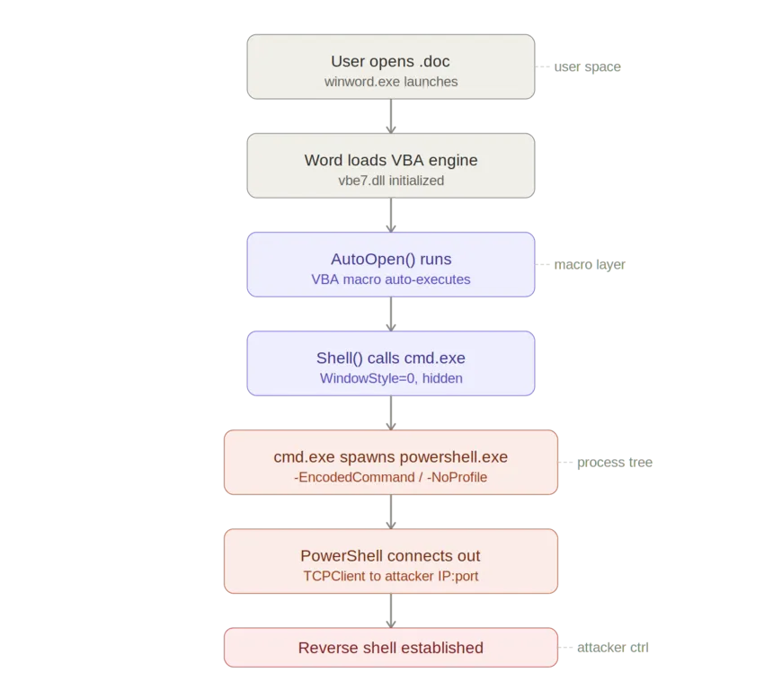 Most macro office attacks rely on a macro that runs automatically, like AutoOpen() to ensure the attack begins as soon as the document is opened, without the user doing anything else. The macro often Shell(), WScript.Shell, or CreateObject("WScript.Shell") to execute system commands and escape the Office sandbox and interacts with the operating system. cmd.exe or Powershell is invoked to run more complex payloads. This may be a Powershell one-liner that establishes a connection to the attacker’s server to download additional malware or runs encoded commands to evade detection