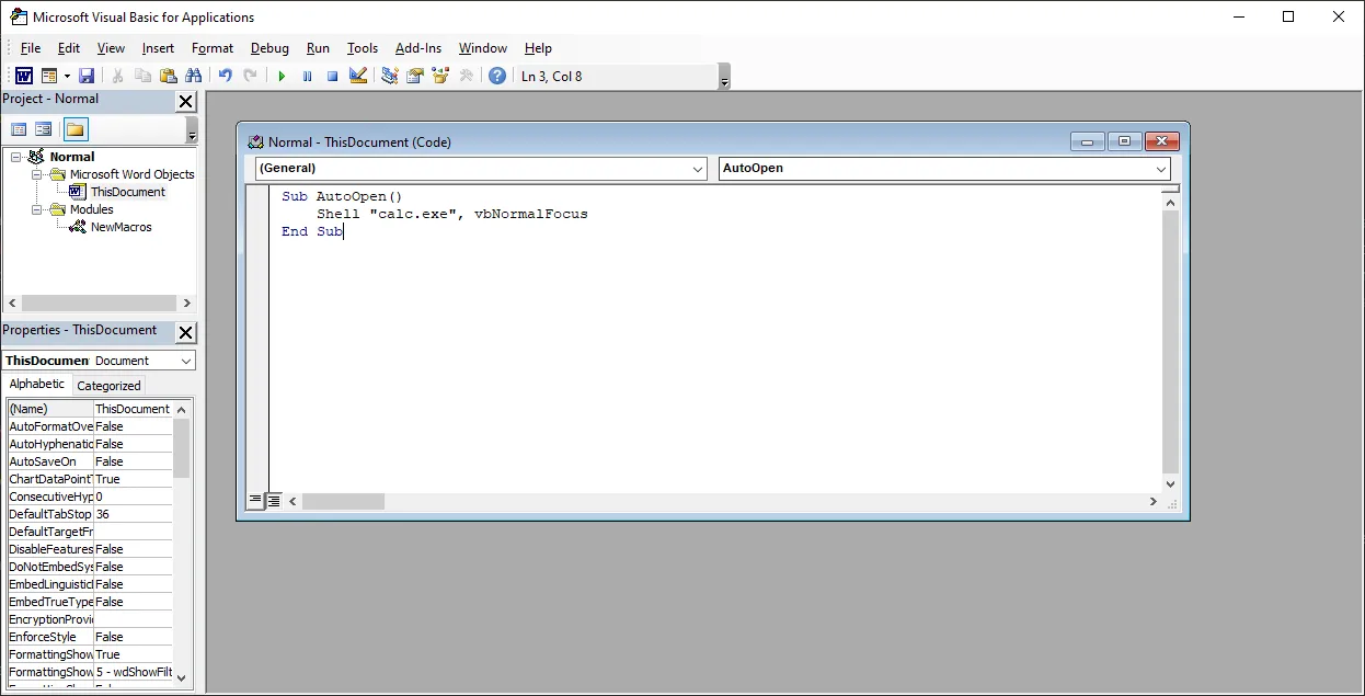 Save the document as A macro-enabled document with the .docm extension and quit. When you reopen the document, the VBA script will execute and open calculator.