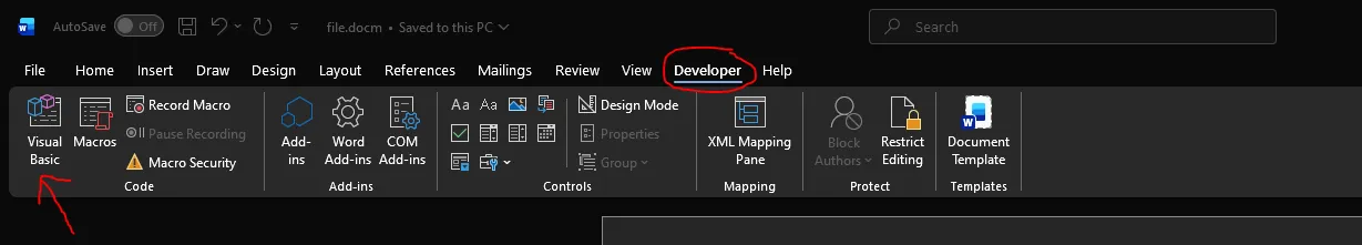 To start, open a new office documents (docs or excel) and go in the developer tab. If it’s hidden, which is the case by default in later version of office, then go File->Options->Customize Ribbon and check the Developer checkbox